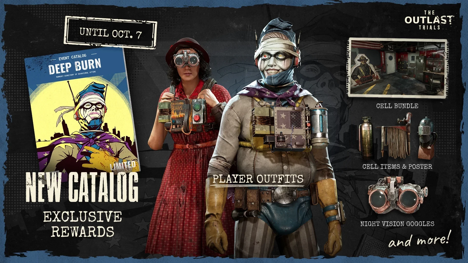 Вплоть до 7 октября также можно получить лимитированные косметические предметы Deep Burn. В тематический каталог входят костюмы и украшения для камеры, а также очки ночного зрения в качестве аксессуара. Что касается остальных новшеств, то теперь найденные документы будут разделены по темам, чтобы фанатам The Outlast Trials было проще следить за нитью сюжета.
