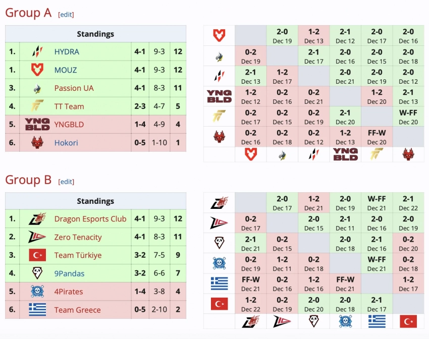 В группе А на этих позициях расположились HYDRA, MOUZ, Passion UA и TT Team. В группе В эти места заняли Dragon Esports Club, Zero Tenacity, Team Türkiye и 9Pandas. Игровые пары первого раунда еще неизвестны.