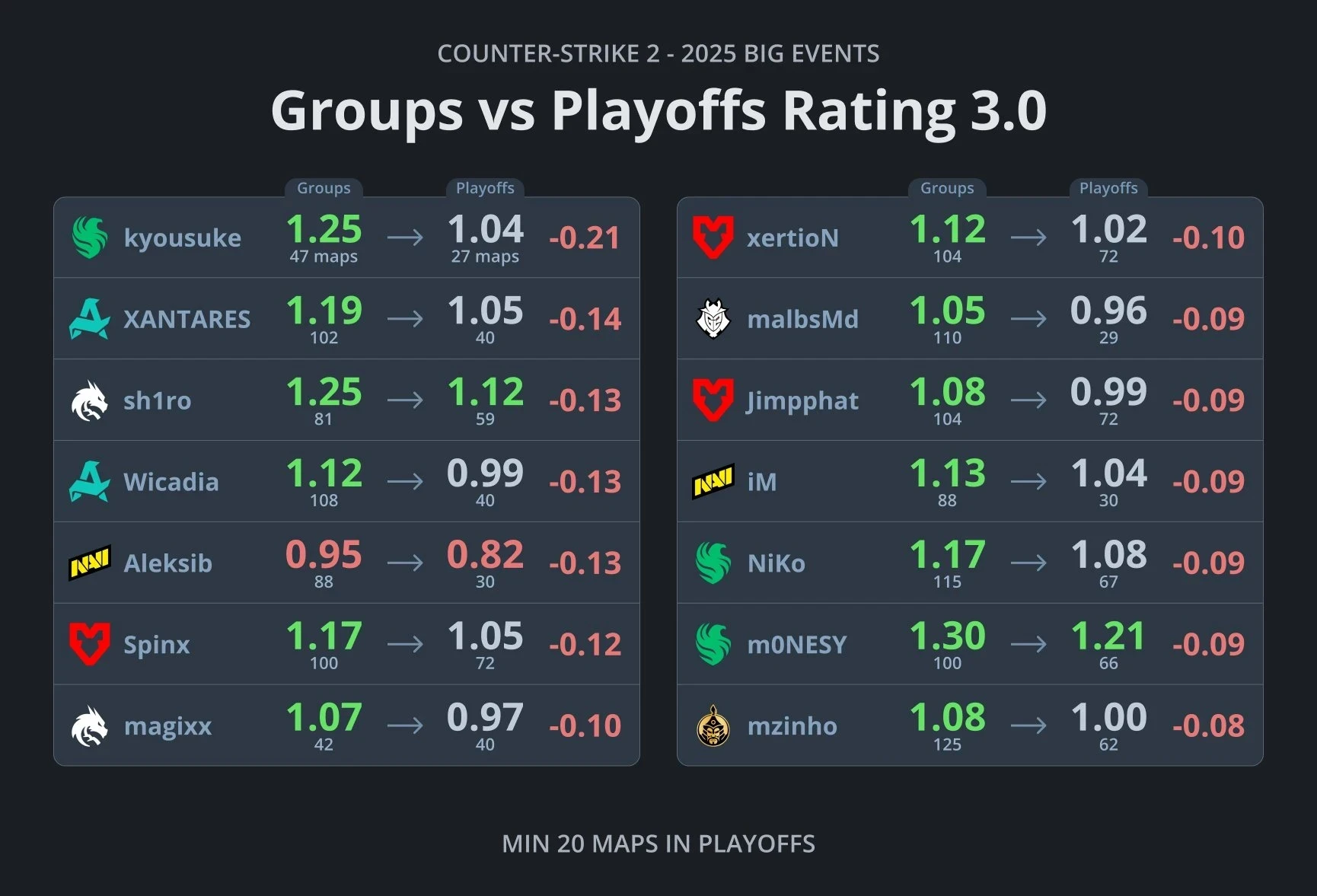 В выборку попали киберспортсмены, сыгравшие не менее 20 карт в решающих стадиях крупных ивентов.