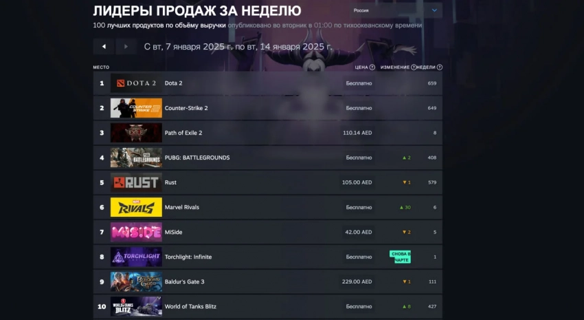 Пару пунктов на этой неделе потеряли PUBG: Battlegrounds и Path of Exile 2 — у них четвёртое и пятое места.