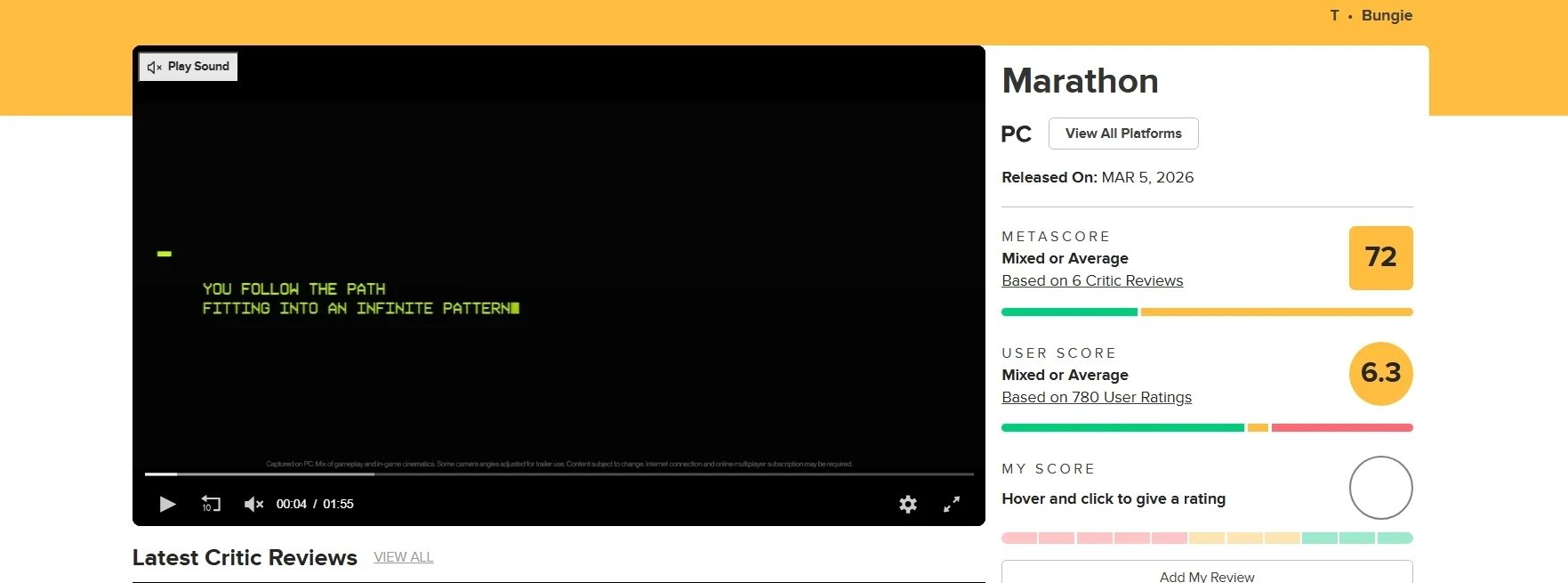 И так далее. При этом, согласно оценкам на агрегаторах, Marathon встретили со смешанными чувствами. На Metacritic шутер получил 72 балла (13 обзоров) и 6,3 балла — журналистов и игроков соответственно.