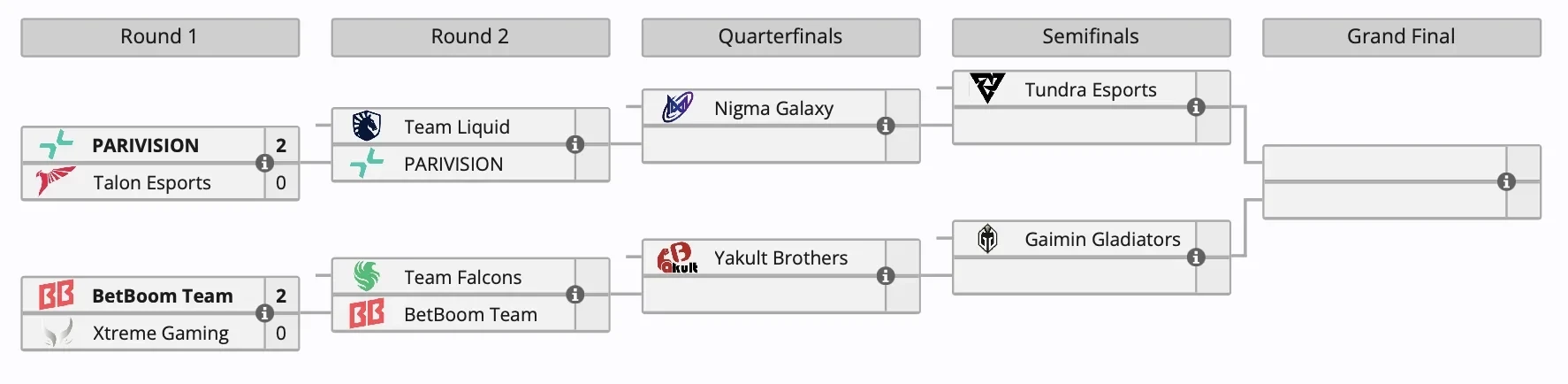 Проигравшие заняли 9-10 место и заработали по 25 тыс долларов. Победители прошли дальше по сетке. PARIVISION сыграет с Team Liquid, а BetBoom Team встретится с Team Falcons.