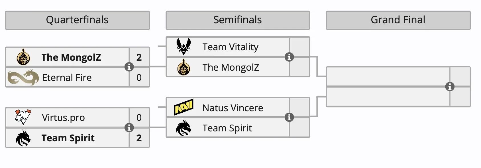 8 февраля определятся финалисты турнира. Team Vitality сыграет с The MongolZ, а Natus Vincere сразится с Team Spirit.
