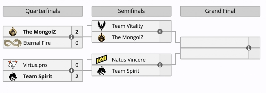 The MongolZ разобралась с Eternal Fire, причем вторая карта даже вышла на овертаймы. А вот Virtus.pro проиграла Team Spirit, выиграв на первой карте только два раунда. Итоговый счет матчей — 2:0.