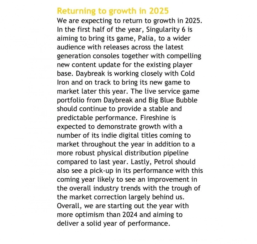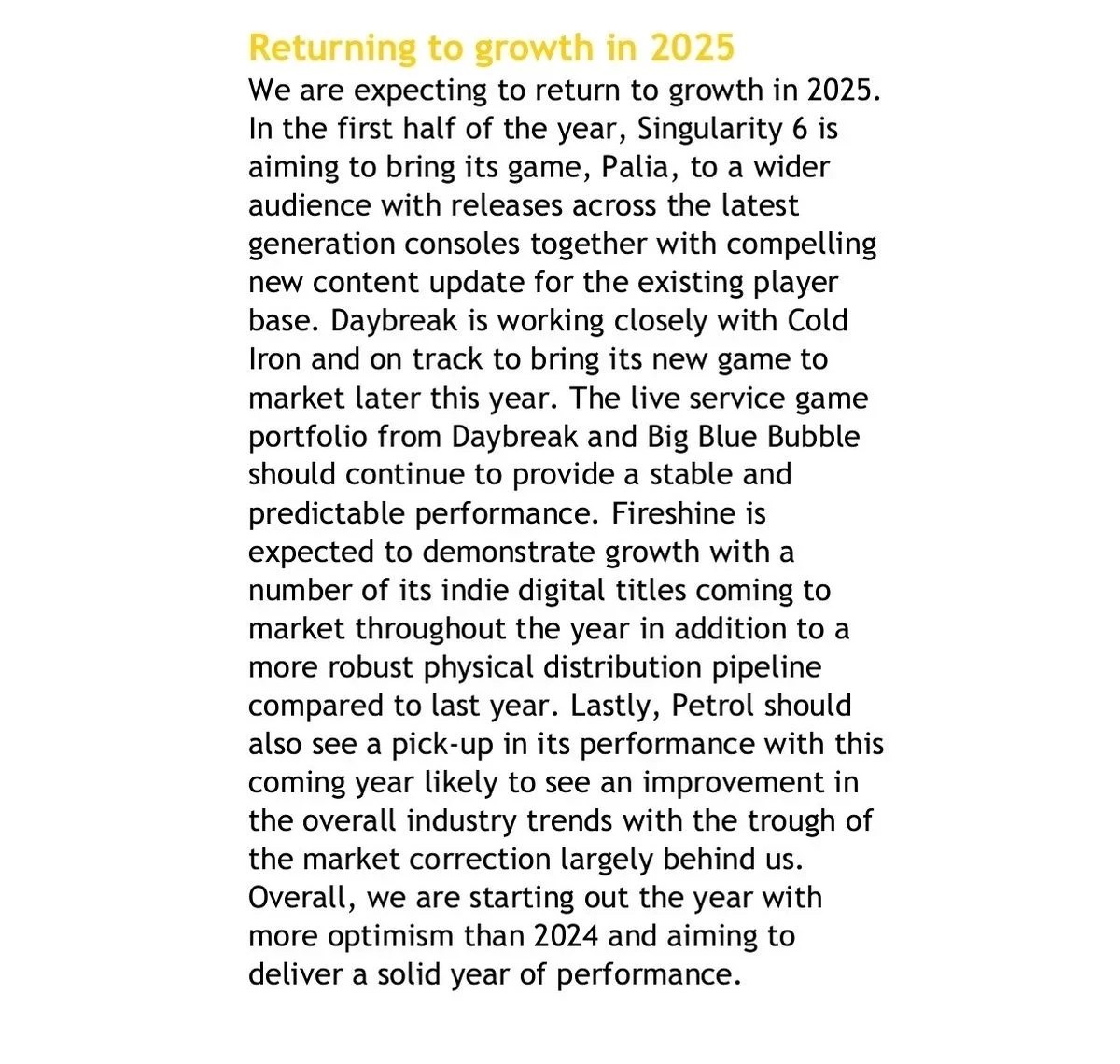 Как сообщалось ранее, 2024 год стал переходным, когда группа сосредоточилась на инвестициях в новые проекты для среднесрочного и долгосрочного роста. Ожидается, что некоторые из этих инвестиций, включая Palia и новый проект Cold Iron, выйдут на рынок и принесут пользу группе в 2025 году.