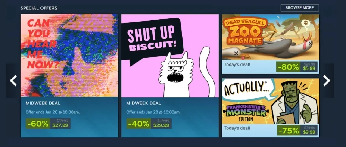 Предложения дня существуют в Steam уже больше 10 лет. Это курируемая промоакция, в рамках которой в течение 24 часов отобранные игры показываются на главной странице Steam, а также на страницах связанных меток и жанров.