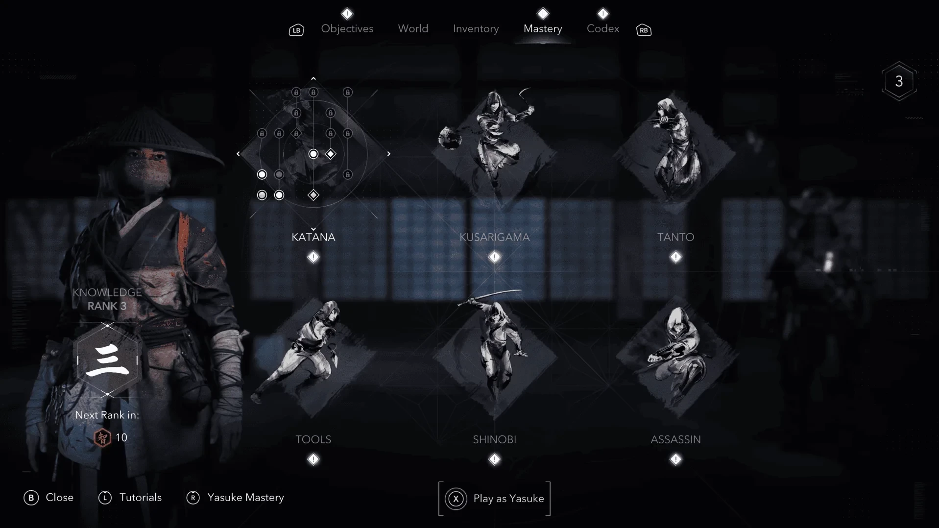Ранги знаний отражают ментальную подготовку персонажей. Повышение уровня знаний происходит через исследование мира (находя потерянные страницы в храмах или уделяя время молитве), выполнение миссий и изучение техник (например, медитация Кудзи-кири для Наоэ и тренировка ката для Ясукэ). Прогресс также делится между персонажами.