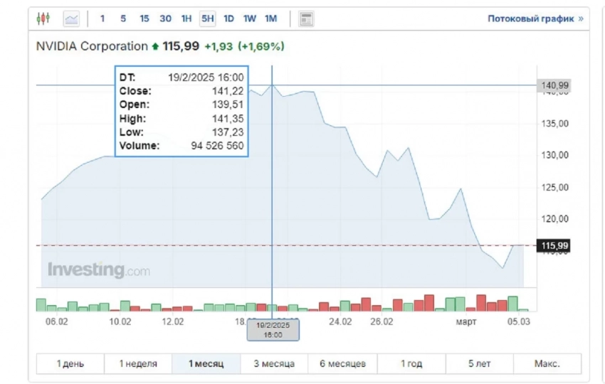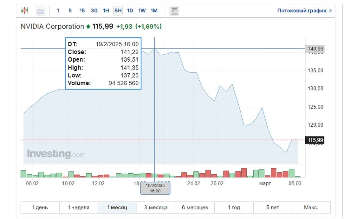 В данный момент стоимость одной акции Nvidia составила 115,99 доллара, однако ещё в феврале максимальная стоимость составляла свыше 140 долларов. Резкое падение произошло 28 февраля, когда с отметки 124 доллара цена акции упала до чуть более 113 долларов — именно по такой цене одна бумага NVDA продавалась в день открытия торгов 3 марта.