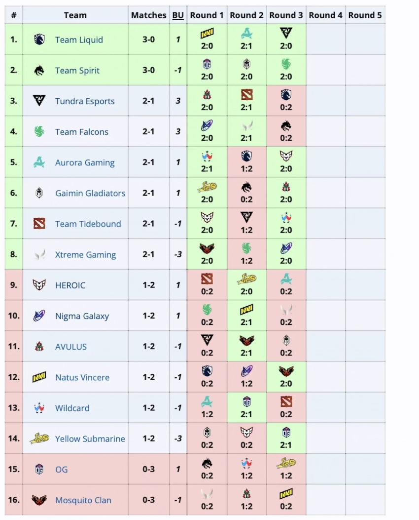 Российский состав и европейская пятёрка одержали по три победы и обеспечили себе место в топ-8. Team Spirit уверенно разобрались с Team Falcons. Liquid же неожиданно переиграли Tundra Esports.