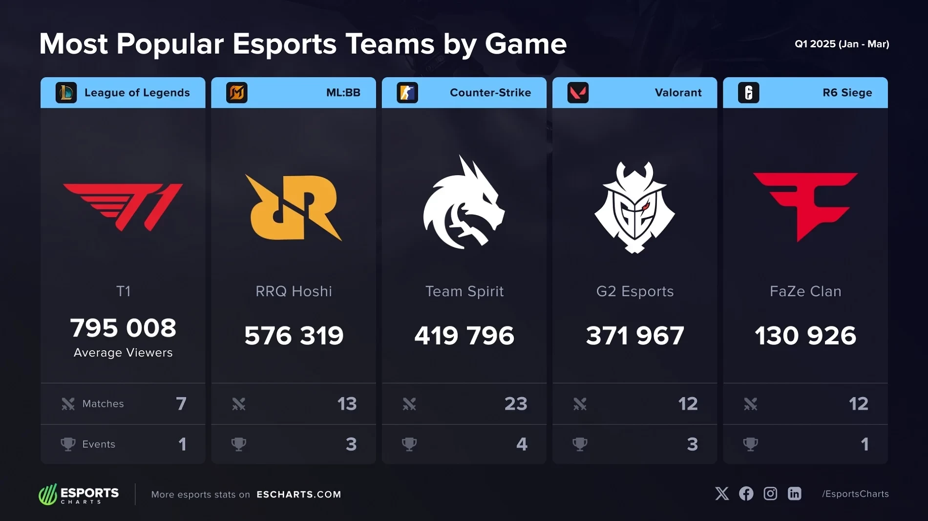 League of Legends — T1 (в среднем 795 008 зрителей);