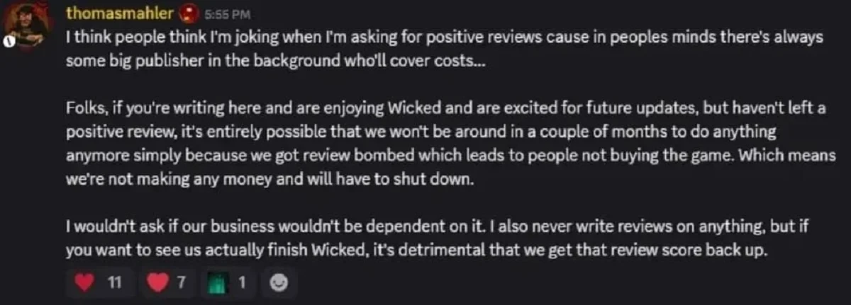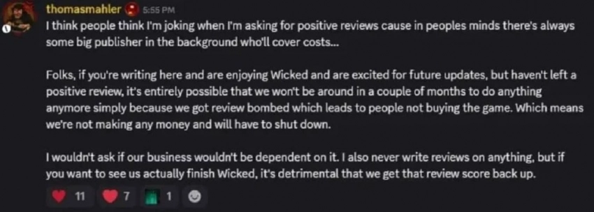 Ребята, если вы сидите здесь [в официальном Discord-канале игры], наслаждаетесь Wicked и с нетерпением ждёте будущих обновлений, но не оставили положительный отзыв [на игру], то вполне возможно, что через пару месяцев нас просто не станет. Просто потому, что нас разнесли в пух и прах, и люди не покупают игру. Это значит, что мы не зарабатываем денег и нам придётся закрыться, — написал Малер.