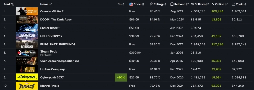Предзаказы Stellar Blade ворвались в лидеры продаж Steam, но уступили DOOM: The Dark Ages