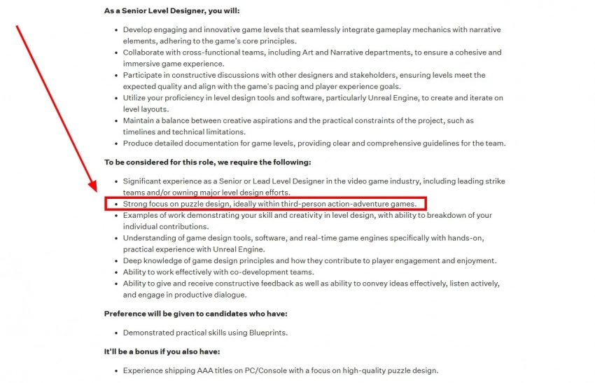 В описании вакансии есть важные уточнения, которые намекают на то, что дизайнер уровней будет трудиться над новой Tomb Raider (2025?). Соискателю в обязательном порядке требуется опыт работы над приключенческими играми от третьего лица с головоломками. Причём желательно, чтобы это были ААА-игры на консолях и PC. Все эти требования отлично подходят под описание очередных приключений Лары Крофт.