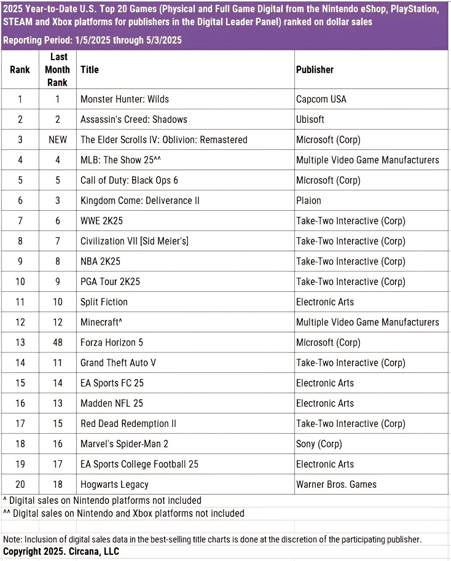 Зато топ-20 самых прибыльных игр в 2025 году (с 5 января до 3 мая) остался практически без изменений. На первых местах всё так же остаются Monster Hunter Wilds и Assassinʼs Creed Shadows, а на четвёртом и пятом — вновь MLB: The Show 25 и Call of Duty: Black Ops 6 соответственно.