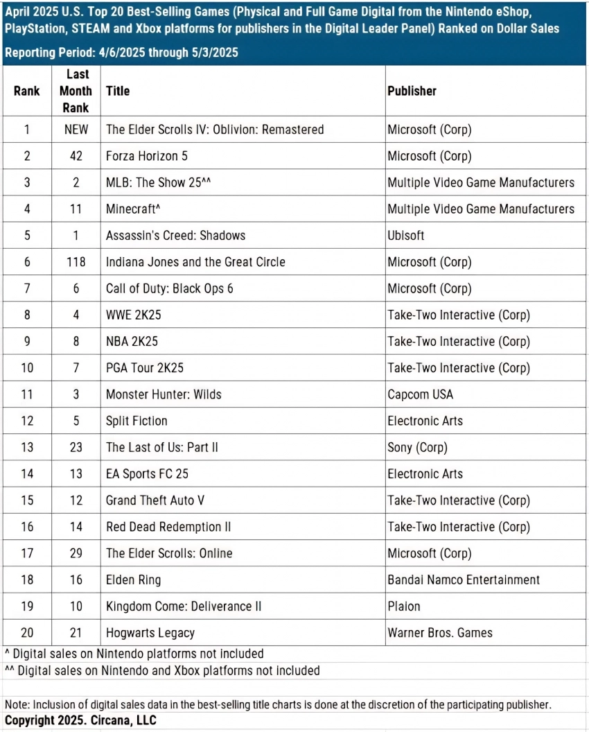 Лидером в списке стала новинка месяца — ремастер ролевой игры The Elder Scrolls 4: Oblivion. Следом идёт ещё одна игра издательства Microsoft — вышедшая на PS5 гонка Forza Horizon 5. А приключение Indiana Jones and the Great Circle, также появившееся на консоли Sony, расположилось на шестом месте.