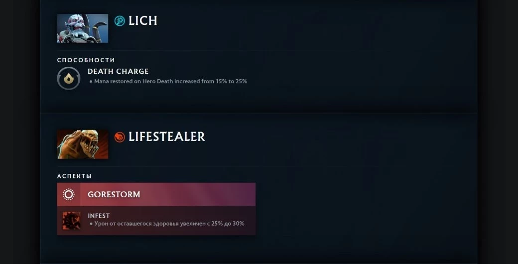 - Broodmother: аспекты Necrotic Webs, Spin Web — паутина уменьшает врагам не только восстановление, но и пополнение здоровья (в том же объёме);