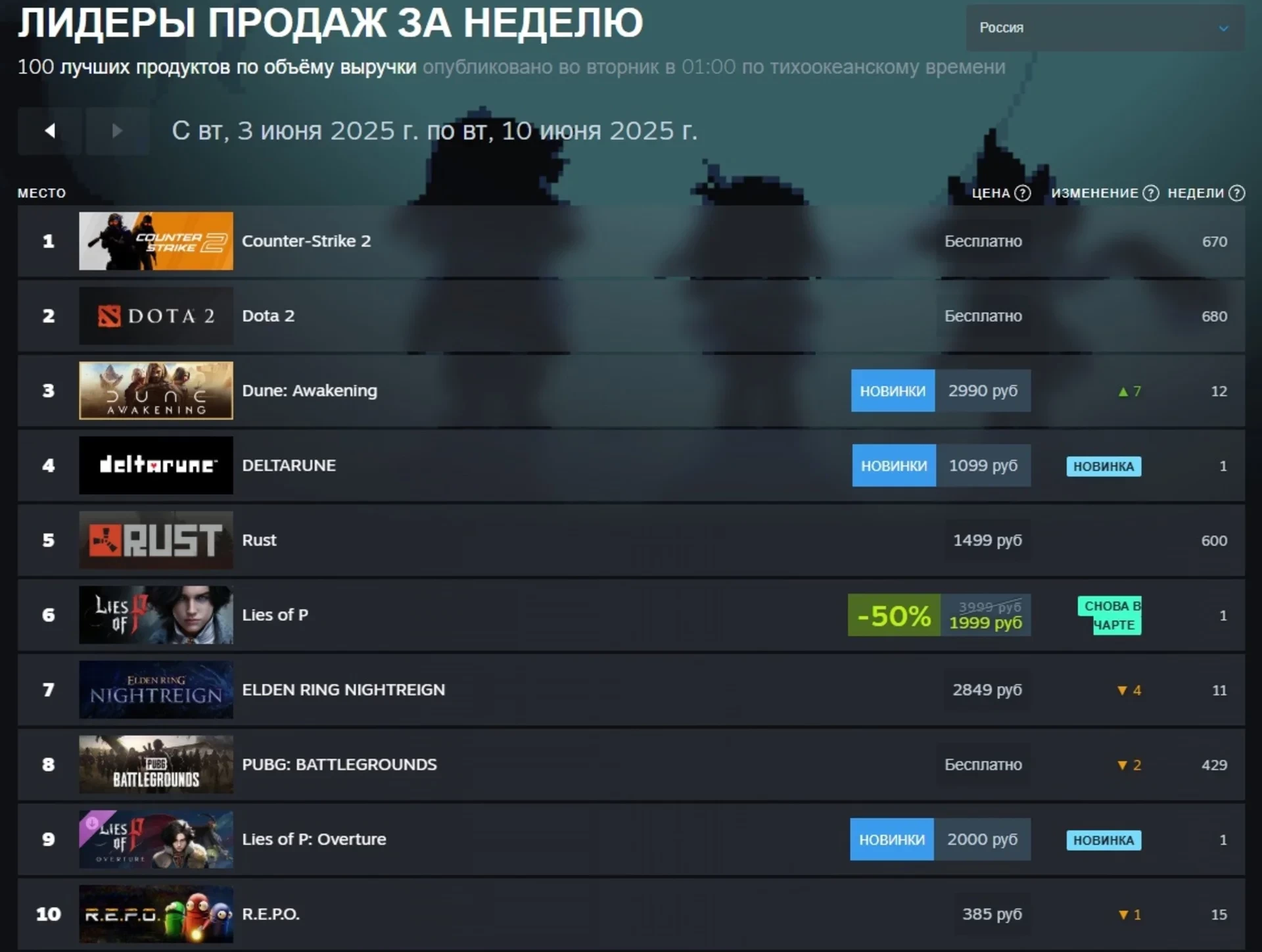 В российском Steam ситуация не сильно отличается. Между Dune и CS 2 в топы пробралась Dota 2. Deltarune, соответственно, спустилась на четвертое место. К слову, Elden Ring Nightreign упала на 7-е, уступив Lies of P и Rust.