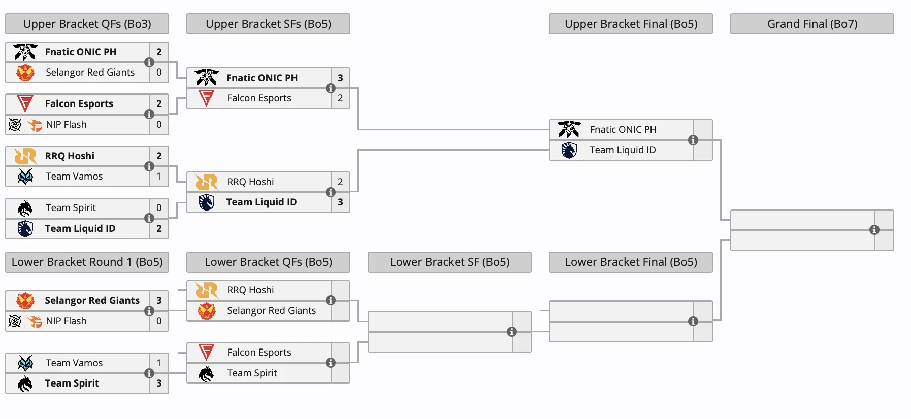 11 декабря Selangor Red Giants сыграет с RRQ Hoshi, а «драконы» встретятся с южноазиатской Falcon Esports. В этот день также сыграют финалисты верхней сетки: Fnatic ONIC PH и Team Liquid ID.