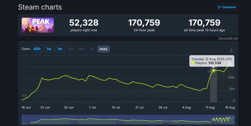 Тогда в Peak находилось более 170,7 тысячи человек, что на 35 тысяч больше прошлого рекорда (12 августа игра привлекла 135,5 тысячи геймеров на пике). Для повышенного внимания к кооперативному приключению есть две причины. Это скидка в размере 38% и недавнее обновление The Mesa, вышедшее 11 августа и привнёсшее в игру пустынный регион, режим для арахнофобов и не только.