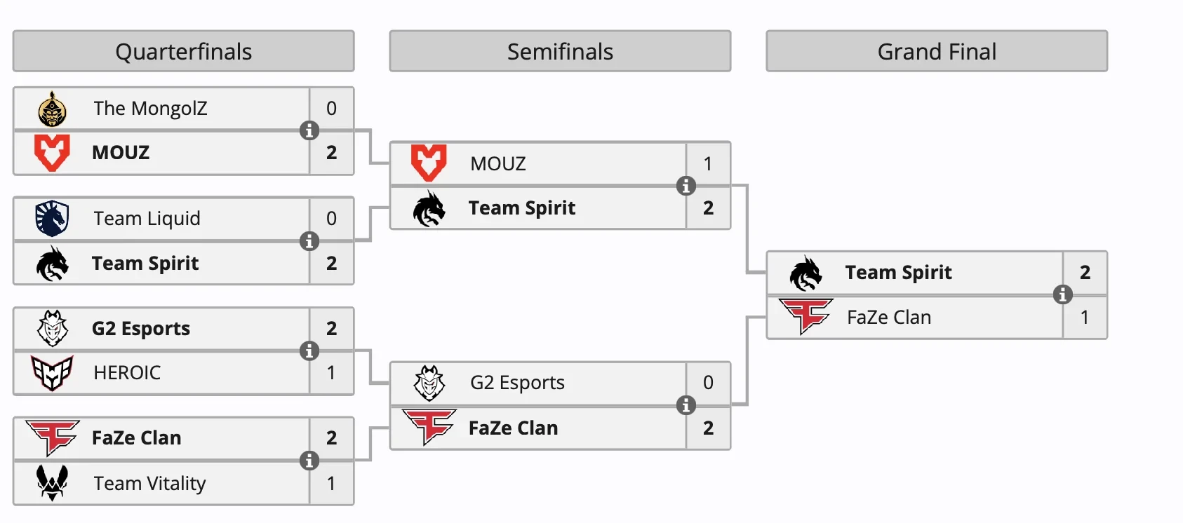 В финале «драконы» встретились с Faze Clan. В напряженном противостоянии Team Spirit одержала победу со счетом 2:1 (13:8 на Nuke, 6:13 на Ancient, 13:11 на Dust 2).