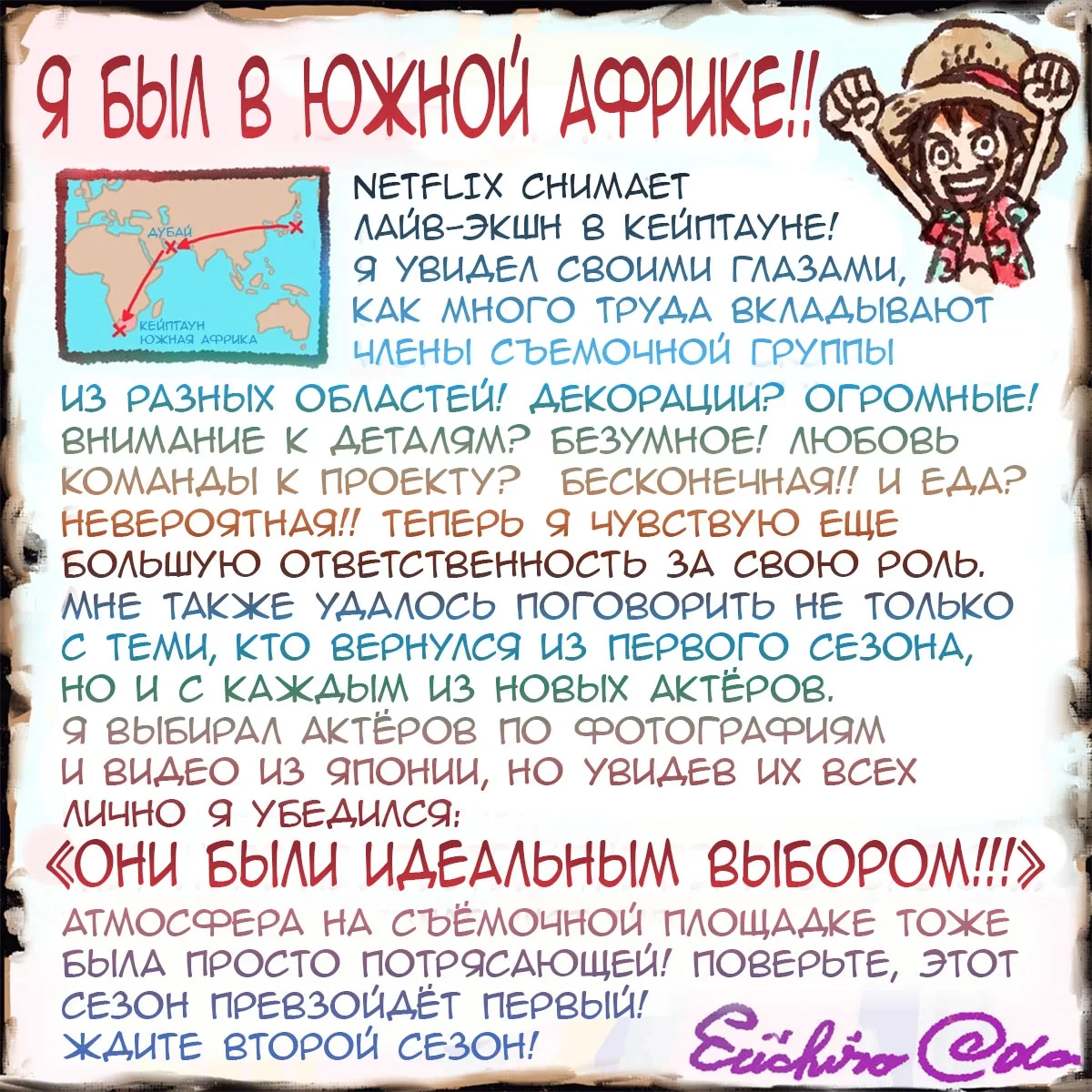Самое интересное о кино на YouTube канале Игромании!Обложка: кадр из сериала One PieceNetflix опубликовала новые фотографии со съёмочной площадки второго сезона «Ван Пис» — сериальной адаптации одноименной манги. Также съемочную площадку в Кейптауне посетил сам Эйитиро Ода, создатель оригинального комикса.