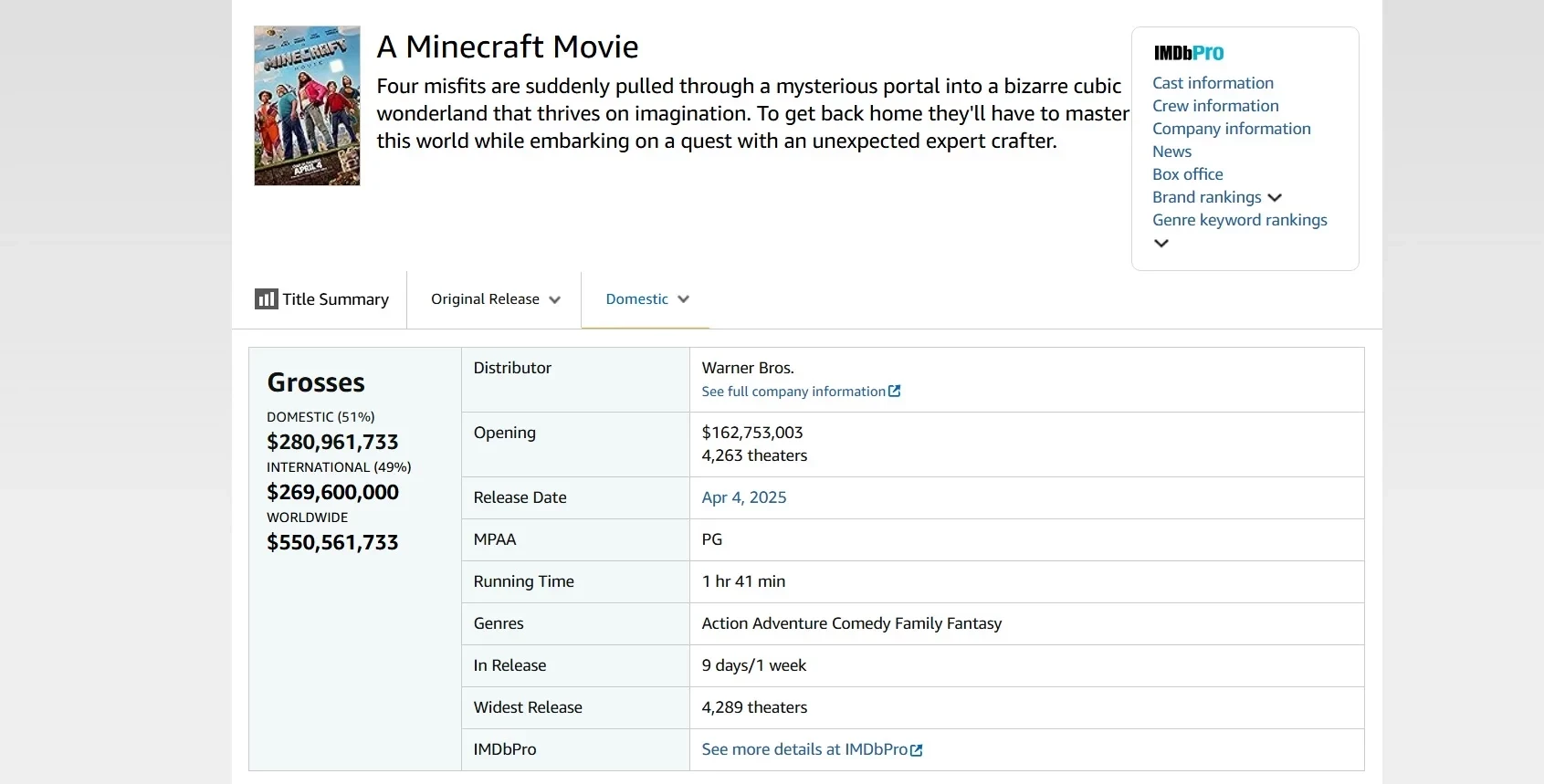 «Minecraft в кино» — 80,6 млн долларов в США (550,5 млн долларов в мире);
