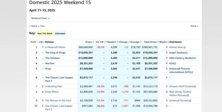Свежий топ-5 кассовых сборов в прокате в США за период с 11 по 13 апреля 2025 года: