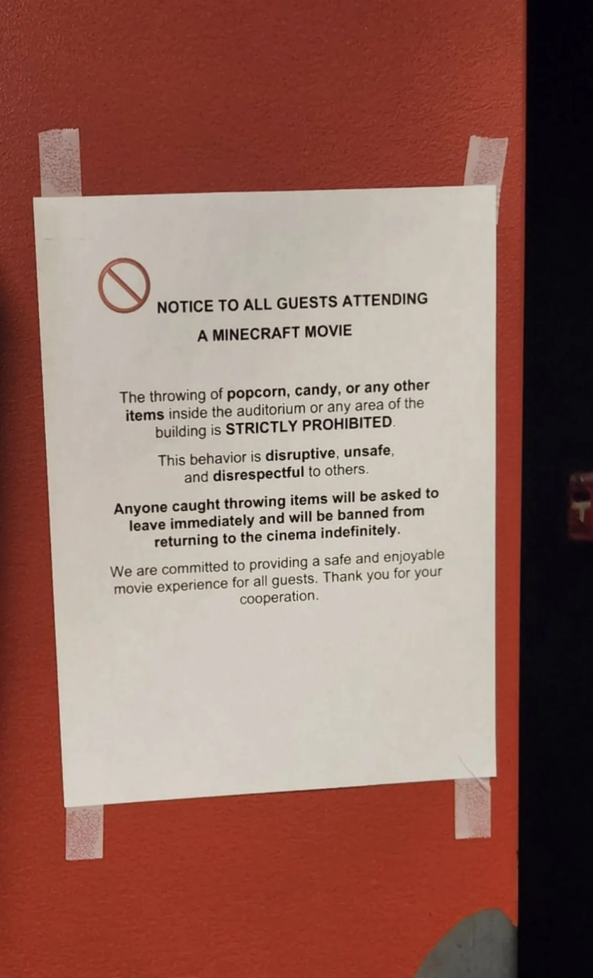К зрителям обратился даже исполнитель главной роли «Майнкрафта», Джек Блэк, который попросил их не кидать попкорн, так как работа уборщиков становится в несколько раз сложнее.