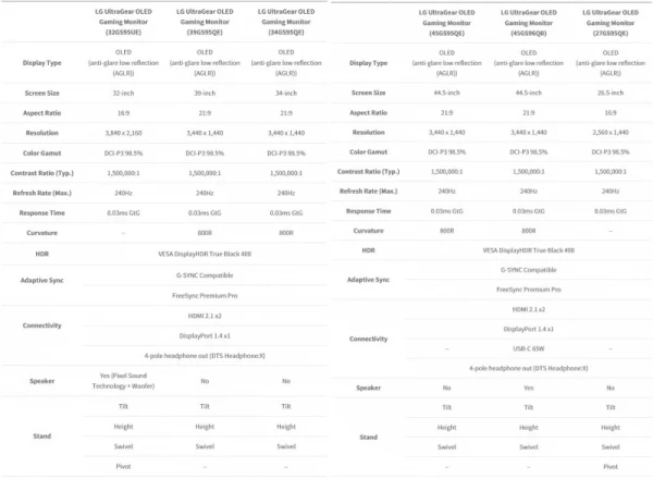 Для 34-дюймовой модели UltraGear OLED 34GS95QE и 39-дюймовой UltraGear OLED 39GS95QE производитель заявляет поддержку разрешения 3440 × 1440 пикселей. Мониторы используют формат 21:9 и оснащены изогнутыми дисплеями с радиусом кривизны 800R. Такой же радиус кривизны, соотношение сторон и поддерживаемое разрешение заявлены для двух 45-дюймовых моделей 45GS95QE и 45GS96QB. Последний оснащён встроенными динамиками.