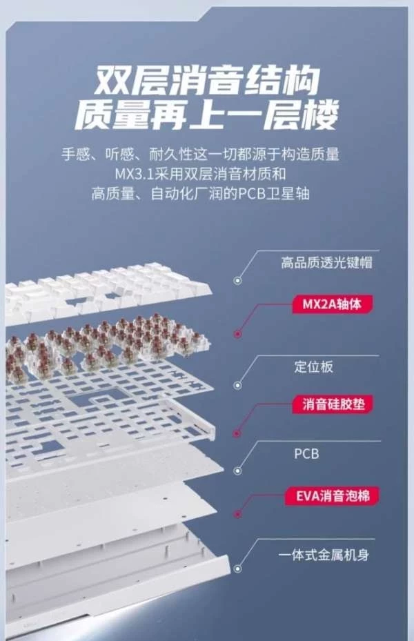 Подключение клавиатуры осуществляется через съемный USB-C кабель в оплетке. Переключатели MX2A, используемые в этой клавиатуре, отличаются стабильностью и высоким качеством, имеют технологию золотых перекрестных контактов и новую бочкообразную структуру шумоподавляющей пружины.