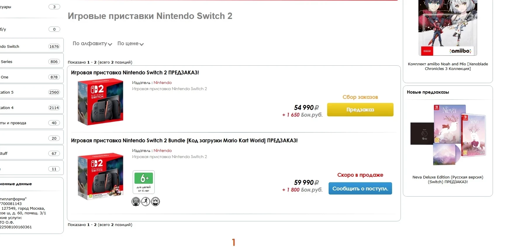 Тем временем в магазине «Видеоигр.Нет» за 60 тыс рублей можно будет приобрести Nintendo Switch 2 в комплекте с кодом загрузки Mario Kart World. Предзаказ просто консоли обойдётся в 55 тыс рублей.