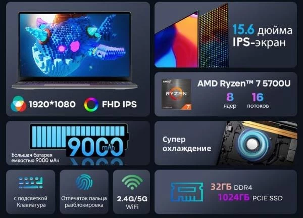 В основу ноутбука Ninkear A15 Plus положен весьма производительный 7-нм процессор AMD Ryzen 7 5700U. Он обладает восемью ядрами и 16 потоками, а его частота достигает 4,3 ГГц. Данный чип также обладает встроенной графикой AMD Radeon, которая включает восемь исполнительных блоков (512 потоковых процессоров) и работает с частотой до 1900 МГц. Также производитель отмечает эффективную и тихую систему охлаждения. Дополняют процессор 16 или 32 Гбайт оперативной памяти DDR4 и скоростной твердотельный накопитель с PCIe на 512 или 1024 Гбайт соответственно.