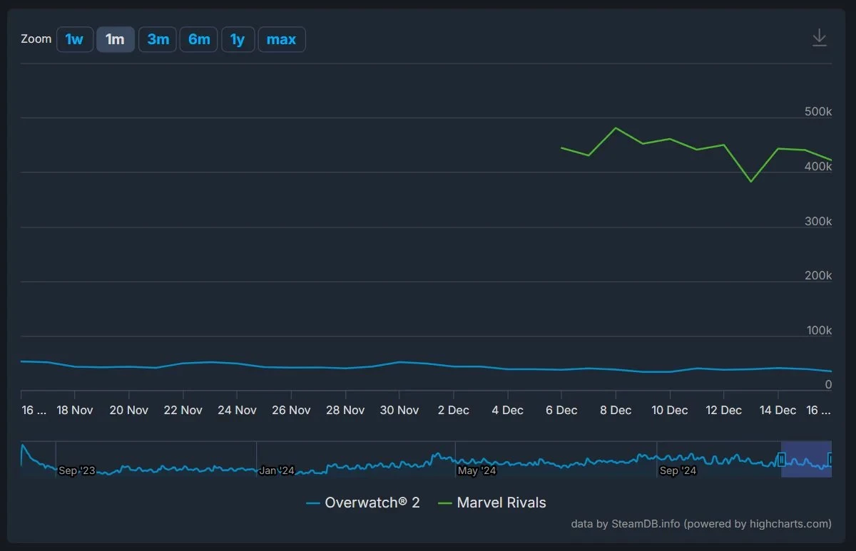 Хотя Marvel Rivals и не позиционировали как «убийцу» Overwatch 2, игроки в обзорах часто сравнивают эти две игры — причём не в пользу последней. В то время как посещаемость боевика NetEase продолжает оставаться высокой, популярность шутера Blizzard остаётся на низком уровне.