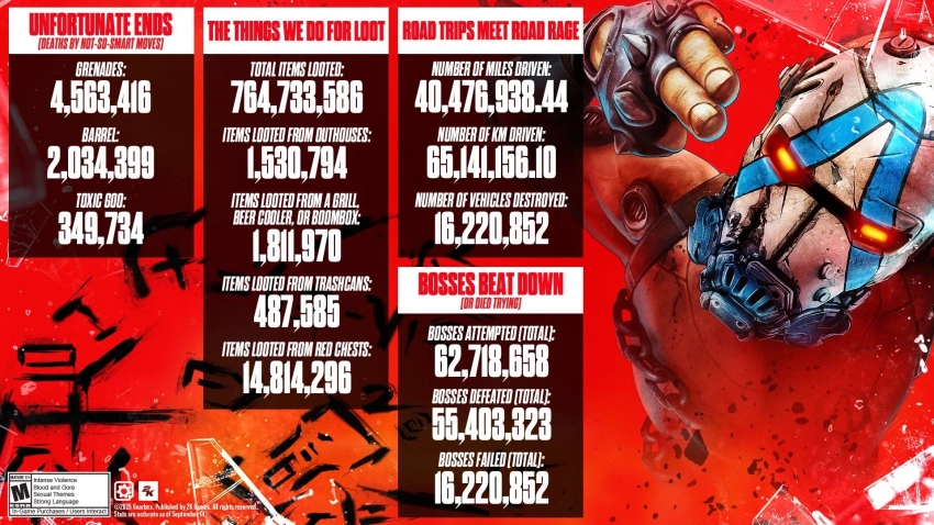 В Borderlands 4 впервые в серии появился бесшовный открытый мир, поэтому неудивительно, что игроки проехали более 65 миллионов километров. За это время геймеры уничтожили более 16 миллионов транспортных средств. И раз речь зашла об уничтожениях, нельзя не поговорить о боссах: их было убито более 55,4 миллиона штук. А вот столкновение с каким-либо боссом закончилось неудачно для игроков свыше 16,2 миллиона раз.