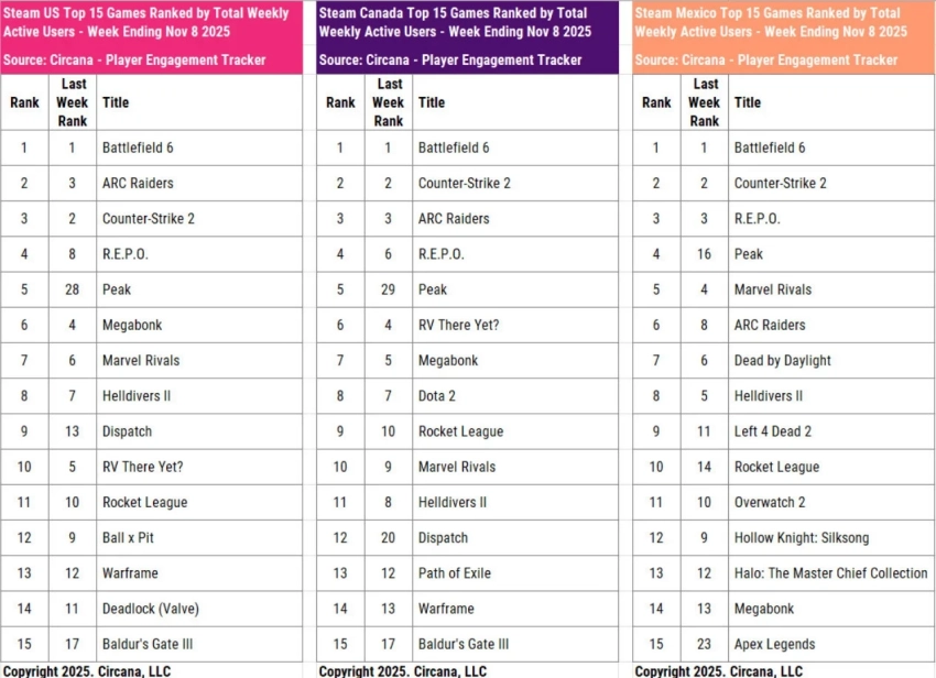 На втором месте по числу активных игроков на PC идёт ARC Raiders. Правда, в Канаде игра лишь закрыла тройку лидеров, уступив позиции Counter-Strike 2. Также аналитики обратили внимание на резкий скачок Peak. На прошлой неделе кооперативное приключение занимало 28-ю строчку, но благодаря крупному обновлению забралась на пятое место. Этого хватило, чтобы обогнать ту же Megabonk и Marvel Rivals, в которой на тот момент ещё не наступил пятый сезон.