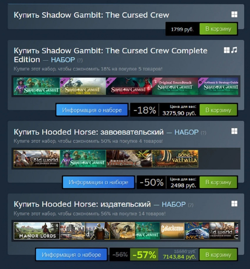 Hooded Horse уже отмечена в качестве издателя Shadow Gambit: The Cursed Crew. Кроме того, игра вошла в состав наборов игр Hooded Horse, в том числе тактика стоит в одном ряду с Manor Lords.