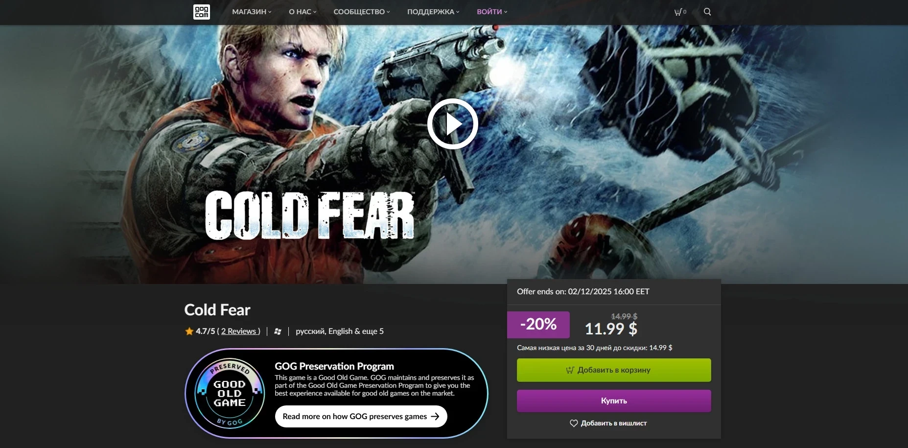 Страница Cold Fear в GOG