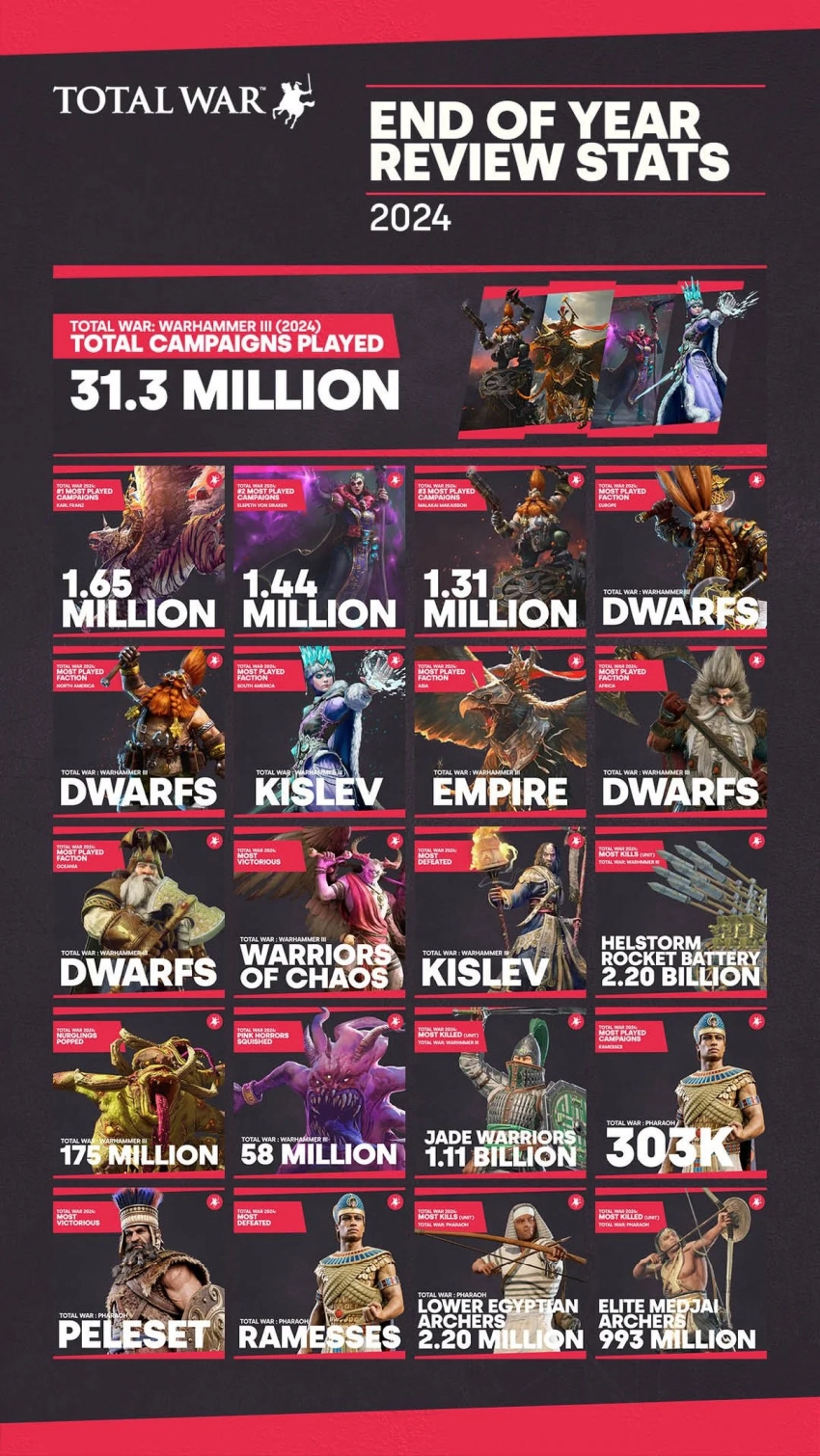 • в Total War: Warhammer III было сыграно 31,3 миллиона кампаний;