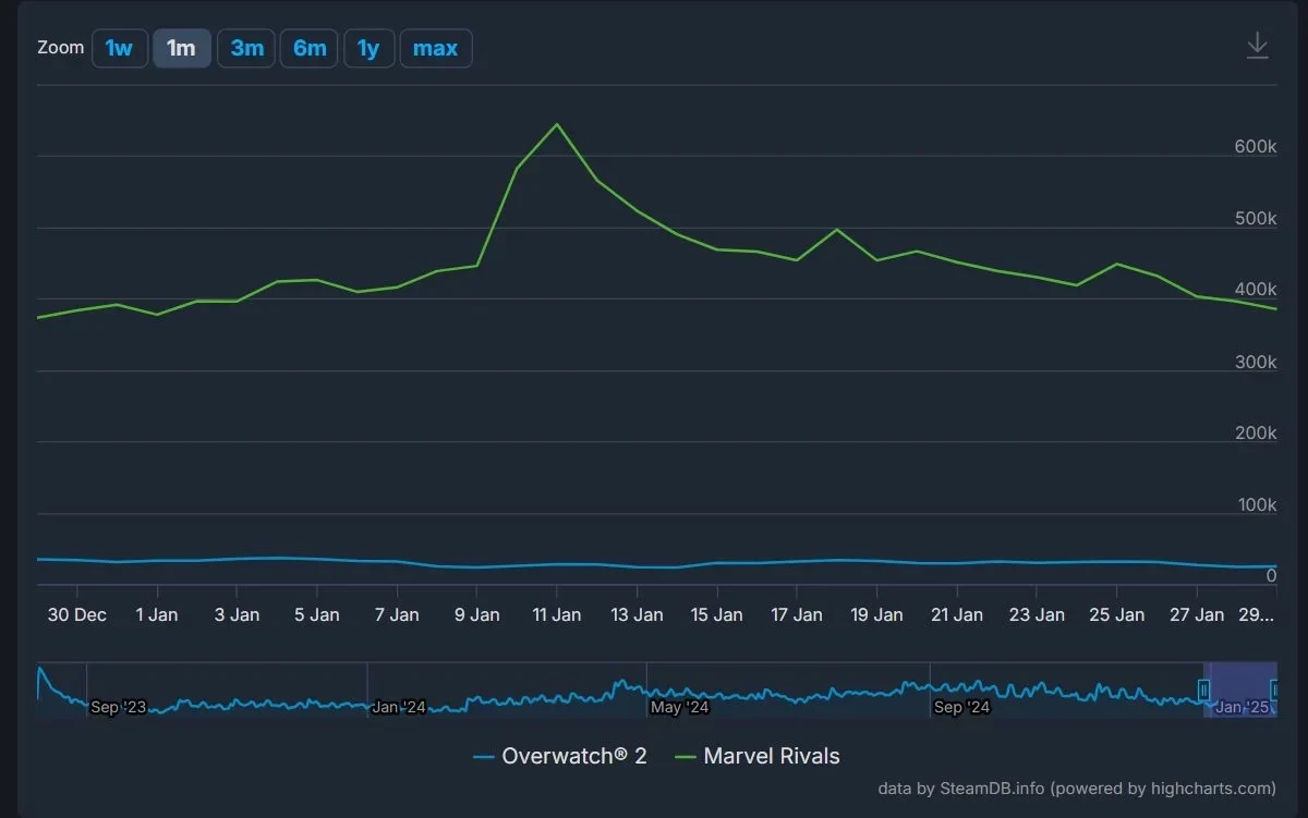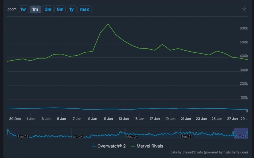 В сентябре, октябре и ноябре 2024 года среднее количество игроков Overwatch 2 составляло около 32-35 тысяч. Marvel Rivals вышла 5 декабря, и, по данным SteamDB, в этом месяце онлайн Overwatch 2 составило 25 тысяч, что на 21,7% меньше.