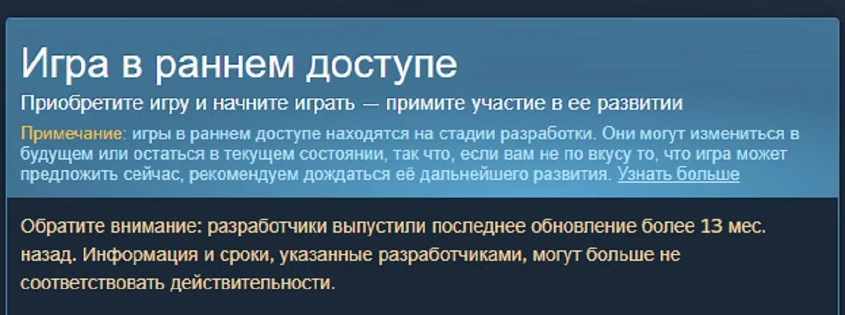Предупреждение выполняет важную функцию — показывает, как активно разработчики занимаются развитием своего проекта. Это поможет покупателям определиться с решением о покупке игры в раннем доступе, а также укажет на риски отсутствия дальнейшей поддержки у проектов без свежих обновлений.