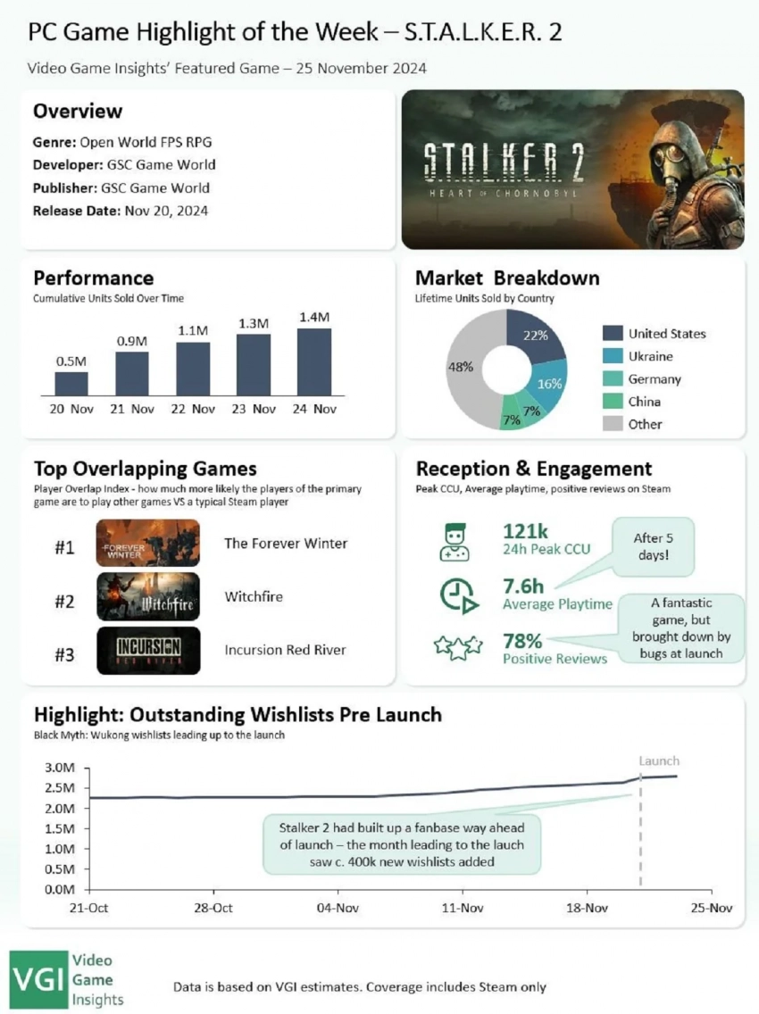 Пиковый онлайн S.T.A.L.K.E.R. 2 в Steam, как мы знаем, превысил 121 тыс игроков одновременно. В VG Insights отмечают, что среднее время игры через пять дней после релиза составило 7,6 часа.