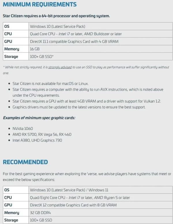 Для запуска Star Citizen потребуется ПК, способный выполнять инструкции AVX. Процессоры, не соответствующие этому требованию, не смогут запустить игру. Кроме того, необходима видеокарта с не менее чем 4 ГБ видеопамяти и драйвером с поддержкой Vulkan 1.2.
