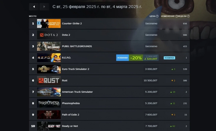 Следом идут Counter-Strike 2 и портативный ПК Steam Deck, который и закрыл троицу лидеров. Что касается новинок в первой десятке, то ими стали кооперативный хоррор R.E.P.O. (пятое место) и симулятор гольфа PGA TOur 2K25 (девятое место).