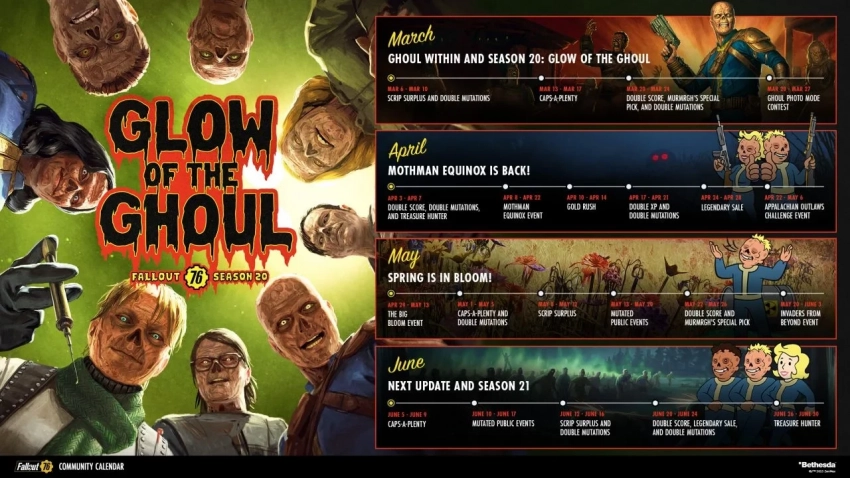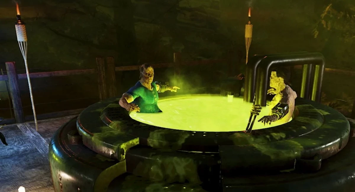 Со стартом Glow of the Ghoul желающие смогут превратиться в постапокалиптических вурдалаков благодаря облучению и крупному обновлению Ghoul Within, приуроченному к новому сезону. Сама процедура пока что не разъясняется, но нам уже предлагают обновить C.A.M.P., обставив его по новейшей моде украшениями и работающим джакузи с радиоактивной жидкостью.