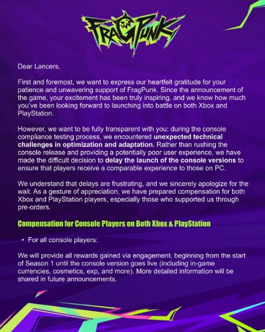 Решение было принято в связи с техническими проблемами при оптимизации и адаптации FragPunk для консолей. Перенос на пока ещё неизвестный срок же связан с желанием предоставить геймерам на PS5 и Xbox Series опыт, сравнимый с тем, что получат PC-игроки на релизе.