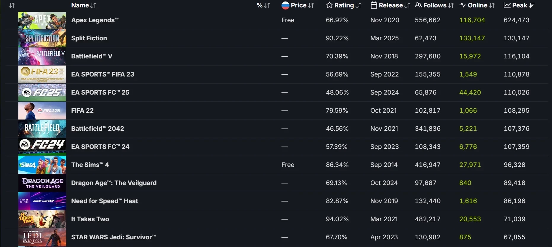 В момент написания новости Split Fiction успела обновить свои прошлые показатели — в игре находится более 133 тысяч человек в Steam, что не дотягивает до более 600 тысяч в условно-бесплатной Apex Legends. А ближайший конкурент новинки — шутер Battlefield V, в котором на пике находилось более 116 тысяч игроков. А у футбольных симуляторов EA Sports FC 25 и FIFA 23 собралось чуть более 110 тысяч геймеров на пике онлайна.