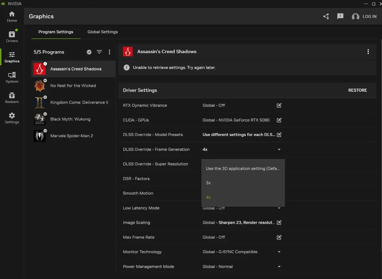 Настройки Assassin’s Creed Shadows в приложении Nvidia
