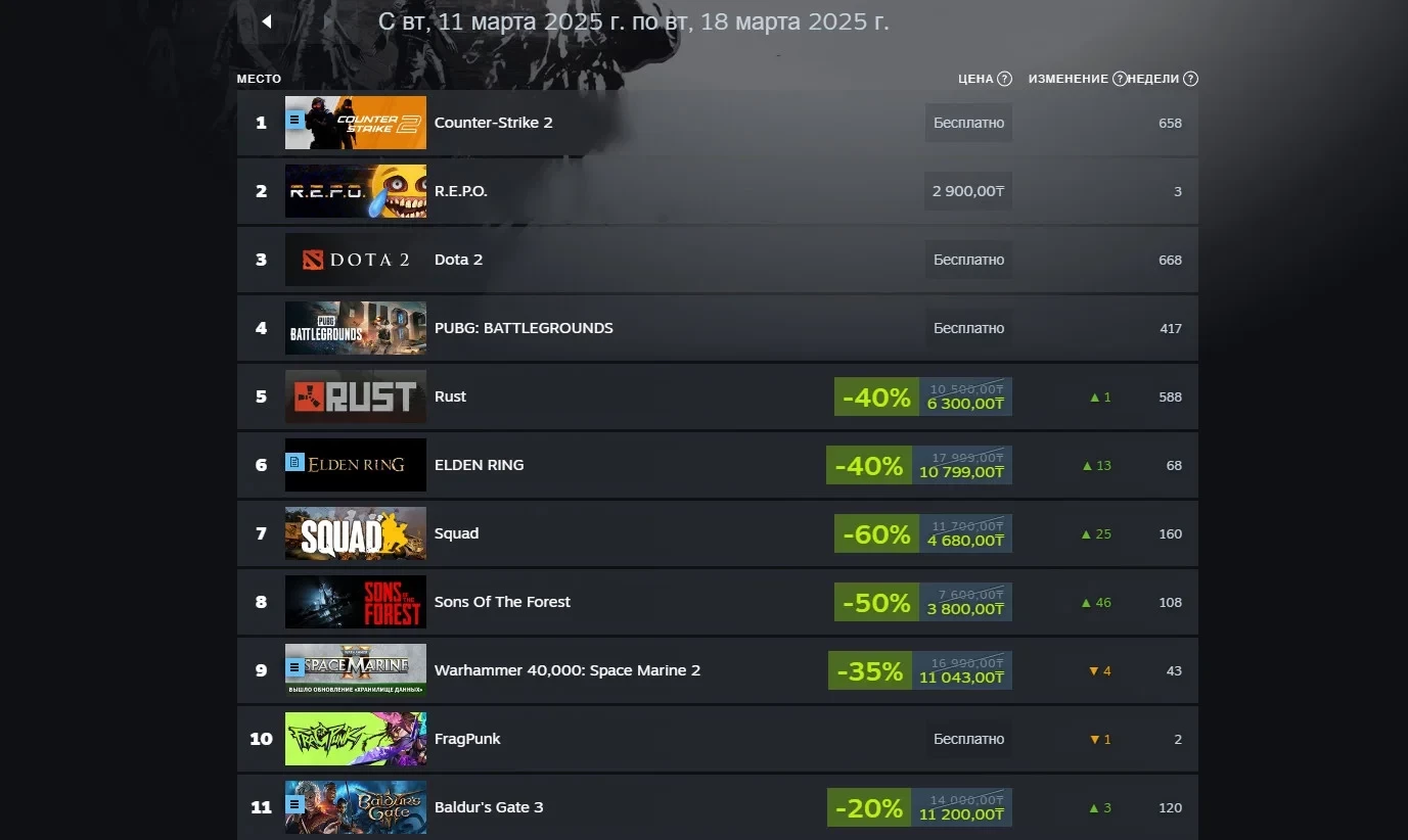 Топ-10 игр по выручке в Steam с 11 по 18 марта 2025 года
