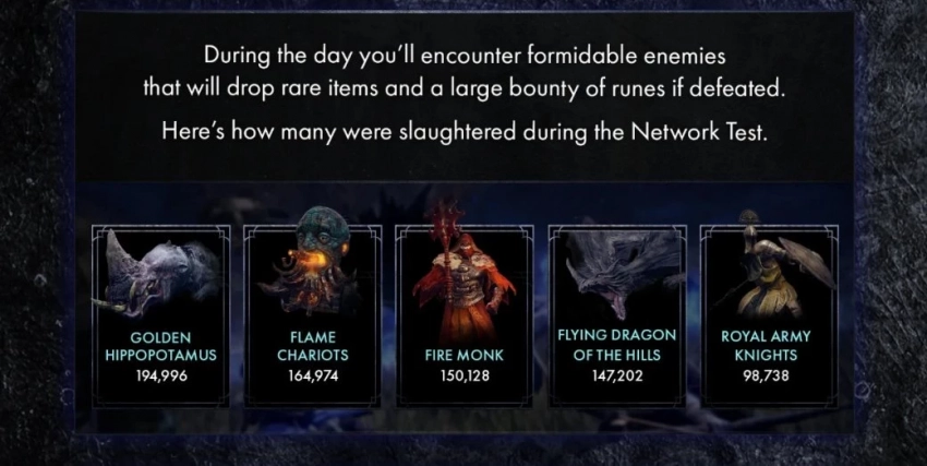 В Elden Ring Nightreign важно успевать вовремя прокачиваться и получать редкие предметы с фарм-мобов. Их них хуже всего досталось золотому гиппопотаму — его убили свыше 194 тысяч раз. Того же огненного монаха сразили лишь 150 тысяч раз, а солдаты королевской армии лишились менее 99 тысяч бойцов.