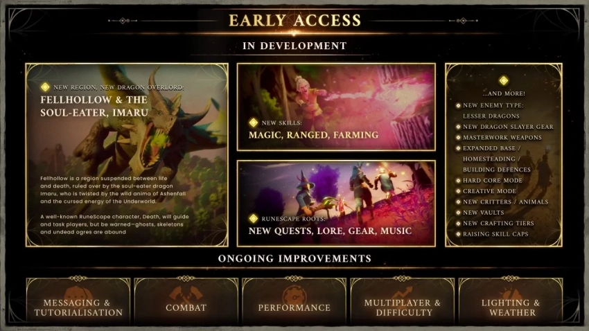 Пока что у грядущих обновлений нет намеченных дат, неизвестны также сроки полноценного релиза. Предположительно до версии 1.0 RuneScape: Dragonwilds доберётся в 2026 году.